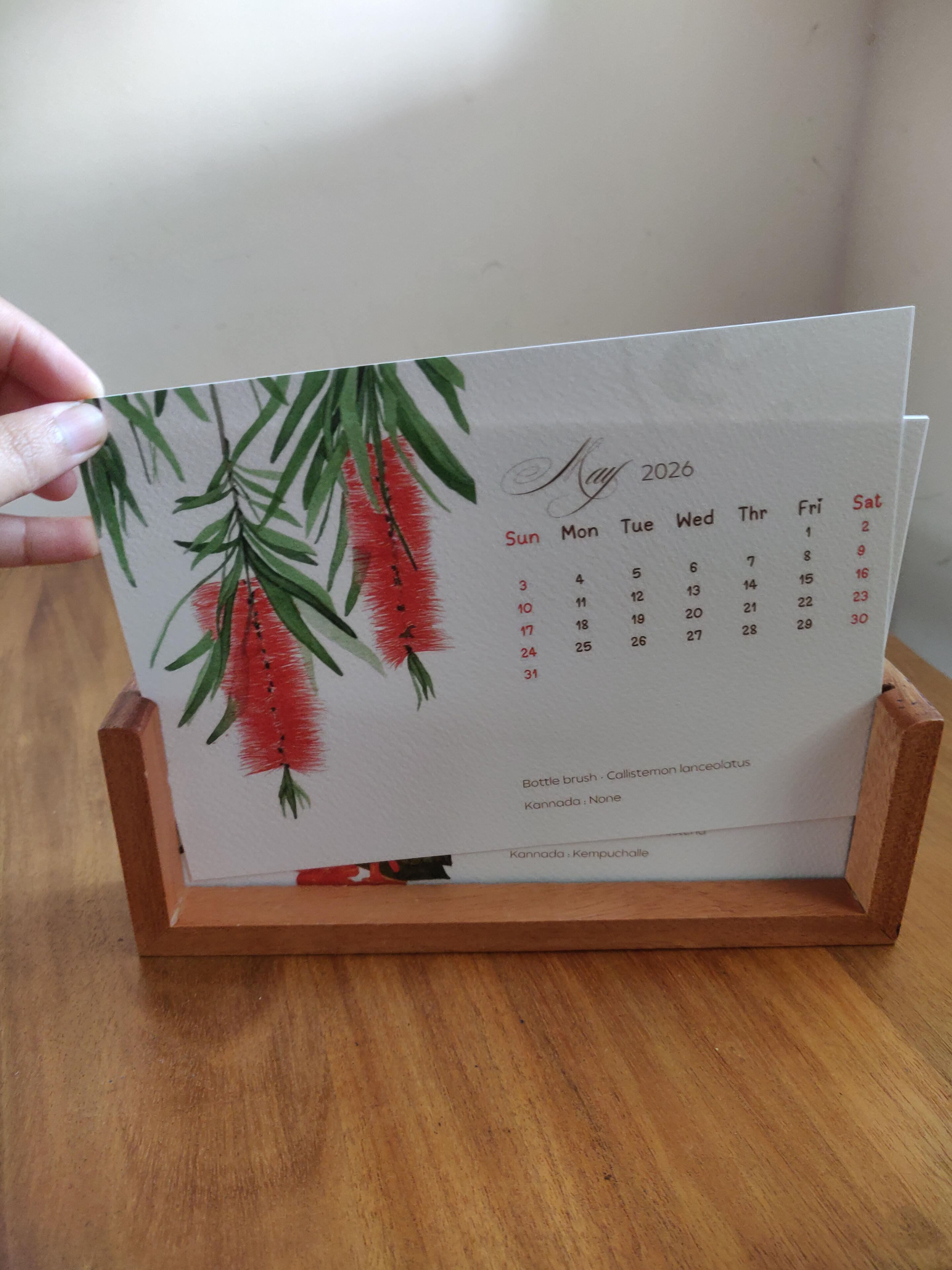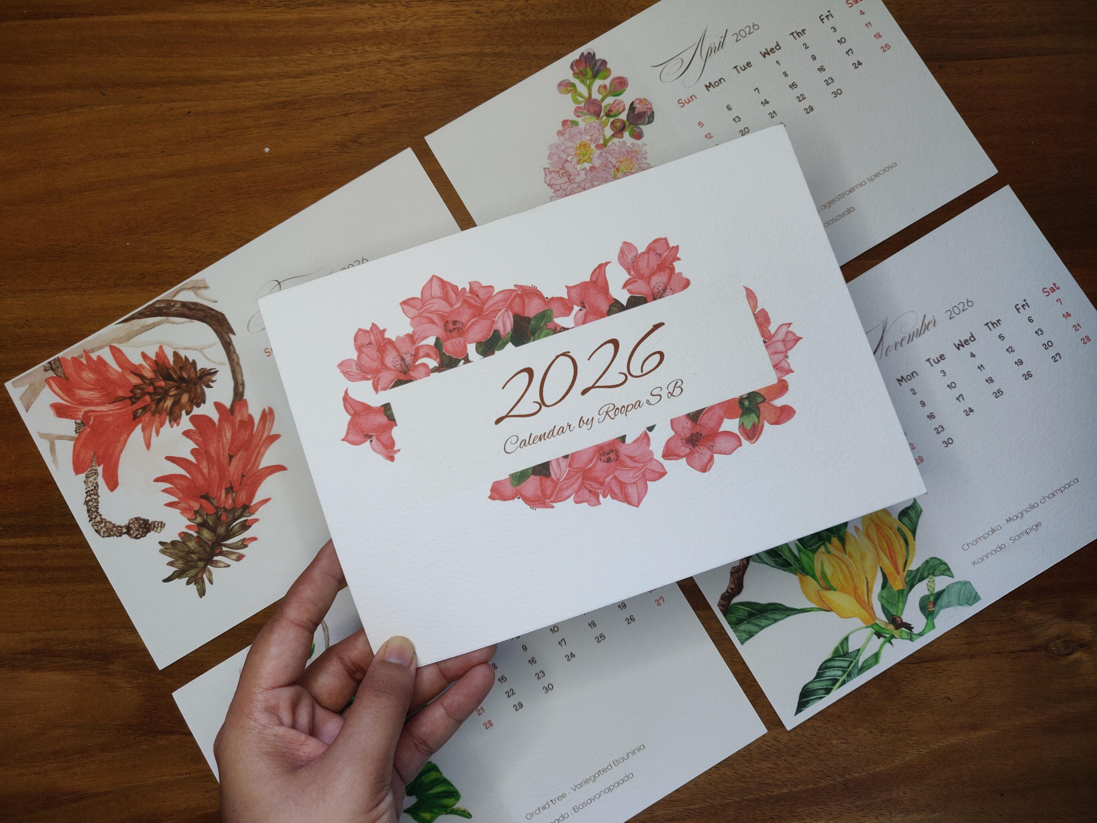 I am Roopa, watercolour artist from Bengaluru. I made this calendar for year 2026. It has 12 unique illustrations of trees of Bengaluru for 12 months. The tree for each month is chosen based on the blooming time. All the illustrations are done in watercolours. The purpose of this calendar is to create a small tree guide of the garden city for people who are learning about it and a souvenir for the people who know and treasure the status.